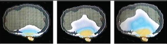 در شکل زیر تفاوت در میزان جذب تابش ناشی از تلفن همراه توسط مغز کودکان 5 و 10 ساله و همچنین مغز یک فرد بالغ را نشان میدهد ( از راست به چپ).